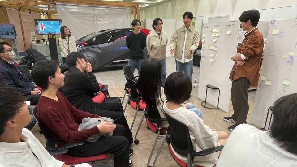 豊田合成の方々と学生が3グループに分かれて未来の車がどうなるかについてディスカッションを行いました. 最後に自分たちが考えたアイデアを参加者全員に聞いてもらい質疑応答も行いました.